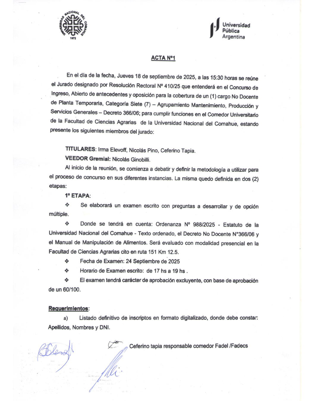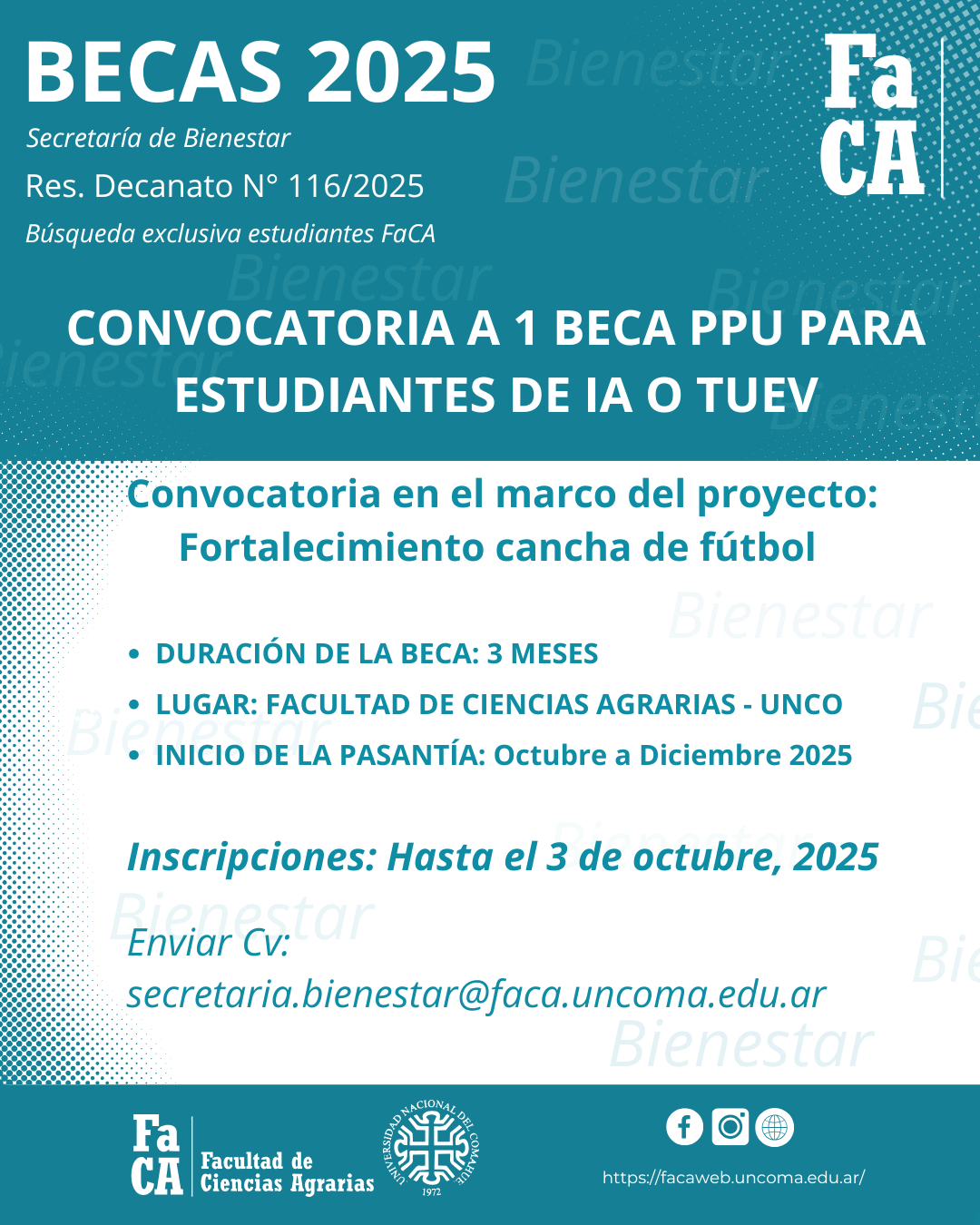 Inscripciones: Hasta el 3 de octubre, 2025Enviar Cv: secretaria.bienestar@faca.uncoma.edu.ar