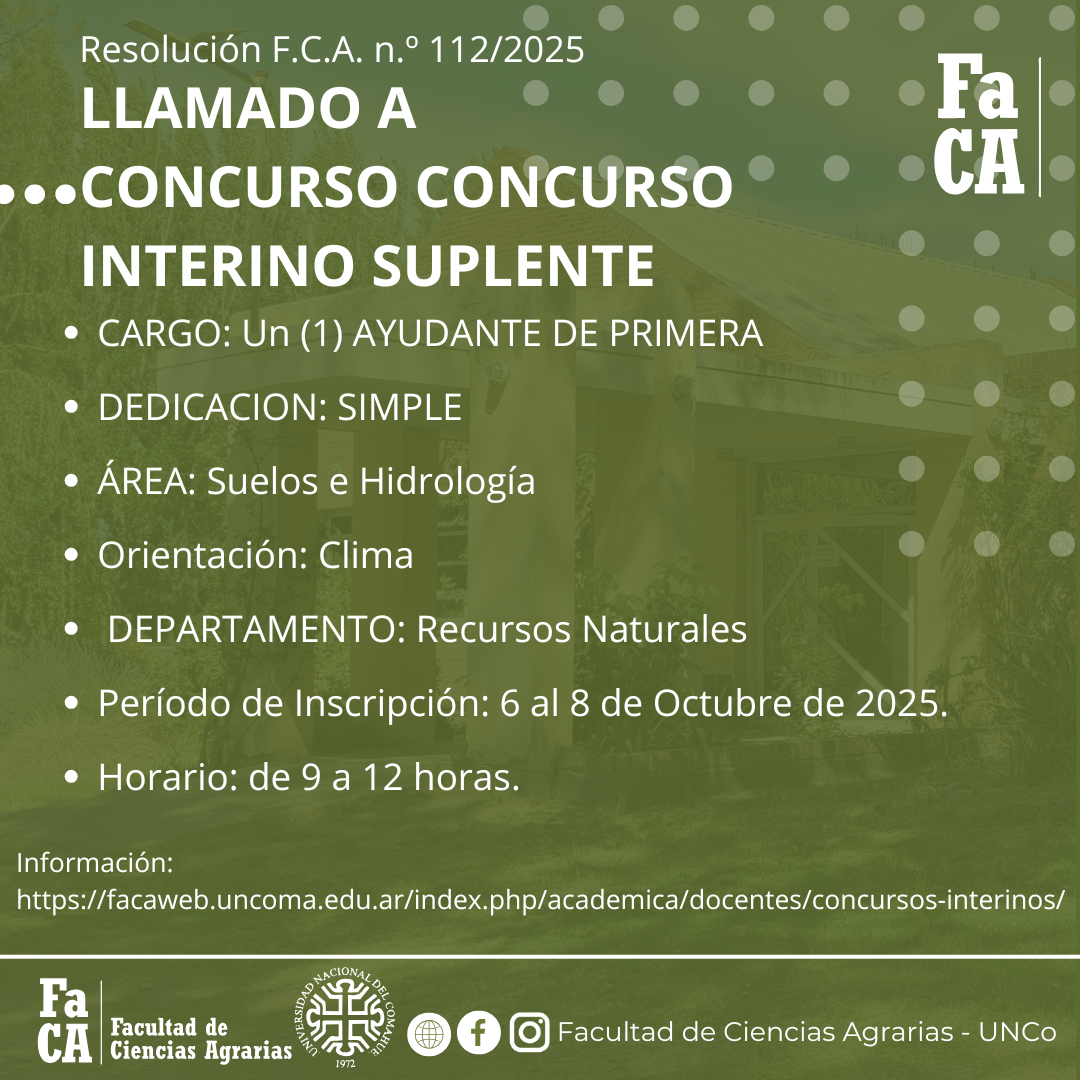 Concursos interinos en la FaCA Período de Inscripción: del 06 al 08 de septiembre de 2025, inclusive. Horario: de 09:00 [...]