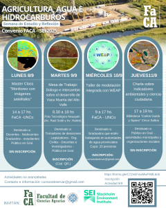 La Facultad de Ciencias Agrarias de la Universidad Nacional del Comahue (UNCo), junto al Instituto Ambiental de Estocolmo (SEI), invita a la Semana de Estudio y Reflexión “Agricultura, Agua e Hidrocarburos”, que se llevará a cabo del 8 al 11 de septiembre de 2025.